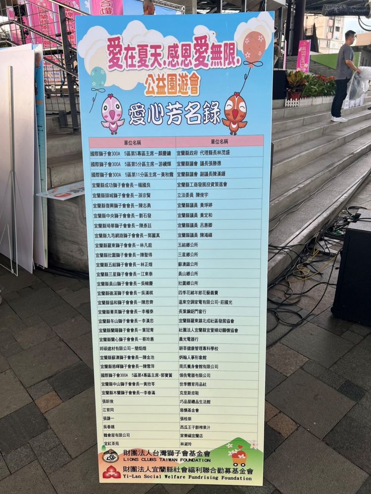 財團法人台灣獅子會基金會(LCTF) 與國際獅子會 300A5 區攜手合作,與財團法人宜蘭縣社會福利聯合勸募基金會共同主辦的「宜蘭聯勸公益園遊會暨愛心表揚大會」,於2025年6月15日(日)在宜蘭羅東文化工場盛大舉行。本次活動由宜蘭縣政府指導,結合在地力量與社福資源,吸引眾多民眾共襄盛舉,場面熱鬧溫馨。